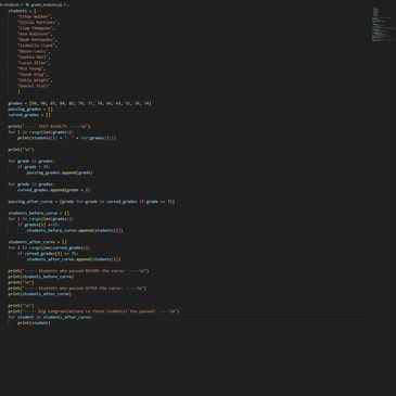 Built a Python program that analyzes student grades, applies a curve, and shows who passes before and after. Focused on loops, list comprehensions, and working with multiple lists.